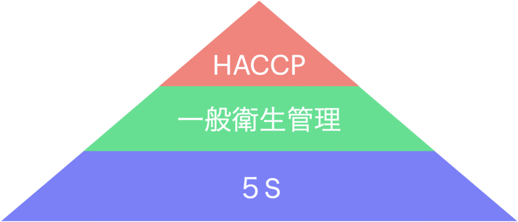 HACCPの前提として、「一般衛生管理」と「5S」が必要です。この点は、忘れられがちですが必須です。左の図がこれらの関係性ですが、この解説はまた別のコラムで解説しますね。